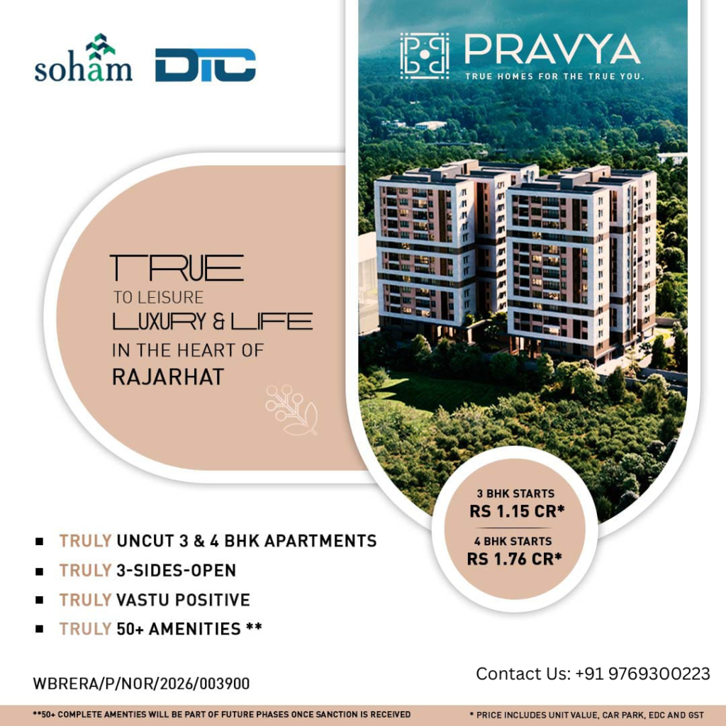 Welcome to PRAVYA, a thoughtfully crafted residential development in Rajarhat that redefines modern living through honesty in design and purpose. Developed by Soham Group in association with DTC Group, PRAVYA offers truly three-side open, vastu-positive homes designed for natural light, ventilation, and everyday comfort.